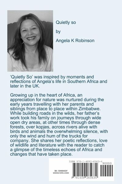 'Quietly So' was inspired by moments and reflections of Angela's life in Southern Africa and later in the UK. Growing up in the heart of Africa, an appreciation for nature was nurtured during the early years travelling with her parents and siblings from place to place within Zimbabwe. While building roads in the wilds, her father's work took his family on journeys through wide open dry areas, at other times through dense forests, over kopjes, across rivers alive with birds and animals the overwhelming silence, with only the wind and hum of the trucks for company. She shares her poetic reflections, love of wildlife and literature with the reader to catch a glimpse of the timeless echoes of Africa and changes that have taken place.