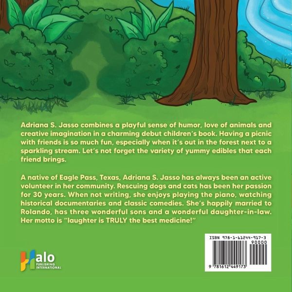 Adriana S. Jasso combines a playful sense of humor, love of animals and creative imagination in a charming debut children's book. Having a picnic with friends is so much fun, especially when it's out in the forest next to a sparkling stream. Let's not forget the variety of yummy edibles that each friend brings.