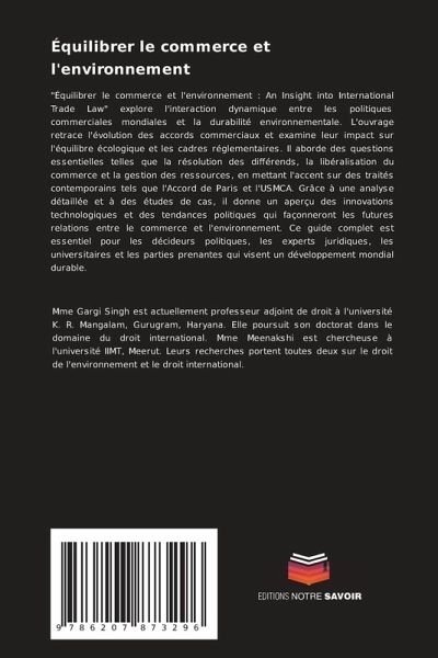 "Équilibrer le commerce et l'environnement : An Insight into International Trade Law" explore l'interaction dynamique entre les politiques commerciales mondiales et la durabilité environnementale. L'ouvrage retrace l'évolution des accords commerciaux et examine leur impact sur l'équilibre écologique et les cadres réglementaires. Il aborde des questions essentielles telles que la résolution des différends, la libéralisation du commerce et la gestion des ressources, en mettant l'accent sur des traités contemporains tels que l'Accord de Paris et l'USMCA. Grâce à une analyse détaillée et à des études de cas, il donne un aperçu des innovations technologiques et des tendances politiques qui façonneront les futures relations entre le commerce et l'environnement. Ce guide complet est essentiel pour les décideurs politiques, les experts juridiques, les universitaires et les parties prenantes qui visent un développement mondial durable.