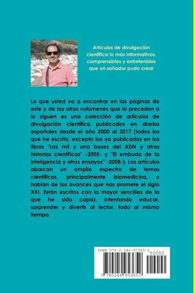 Lo que usted va a encontrar en las páginas de este y de los otros volúmenes que lo preceden o lo siguen es una colección de artículos de divulgación científica publicados en diarios españoles desde el año 2000 al 2017 (todos los que he escrito excepto los ya publicados en los libros "Las mil y una bases del ADN y otras historias científicas" -2005- y "El embudo de la inteligencia y otros ensayos" -2008-). Los artículos abarcan un amplio espectro de temas científicos, principalmente biomedicina, y hablan de los avances que nos promete el siglo XXI. Los artículos están escritos con la mayor sencillez de la que he sido capaz, intentando educar, sorprender y divertir al lector, todo al mismo tiempo.