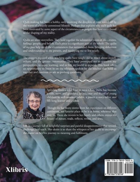 Quilt-making has been a hobby, only receiving the droplets of time tossed off by the waves of a heavily committed lifestyle. Perhaps that explains why each quilt has been motivated by some aspect of the circumstances or people that shaped my reality. Quilts are silent storytellers. They hold together the substantive pieces of life-events, feelings, people, and beliefs. Each piece is a significant part of the whole. The quilts of my past help recall the circumstances that surrounded them, bringing definition and understanding to the present and equipping me to live wisely. The nuggets exposed while stitching quilts have taught me so much about myself, others, and the greater community. They have prompted me to question my perspectives, to enjoy learning, and to free my world to expand. This book offers an opportunity to listen in on the whispers spoken by the stitches that hold us together and continue to ask questions.