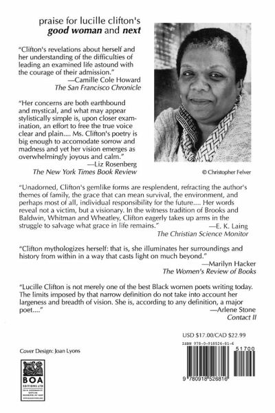 Poetry. African American Studies. "Unadorned, Clifton's gemlike forms are resplendent, refracting the author's themes of family, the grace that can mean survival, the environment, and perhaps most of all, individual responsibility for the future.... Her words reveal not a victim, but a visionary. In the witness tradition of Brooks and Baldwin, Whitman and Wheatley, Clifton eagerly takes up arms in the struggle to salvage what grace in life remains"--E.K. Laing, The Christian Science Monitor.