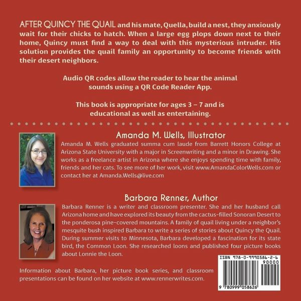 After Quincy the Quail and his mate, Quella, build a nest, they anxiously wait for their chicks to hatch. When a large egg plops down next to their home, Quincy must find a way to deal with this mysterious intruder. His solution provides the quail family an opportunity to become friends with their desert neighbors. Audio QR codes in the book allow the reader to hear the quail calls and owl hoots by using a free QR Code Reader App. In addition, interesting facts about the Gambel's Quail and Great Horned Owl are included on almost every page. This book is appropriate for ages 3-7 and is educational as well as entertaining. Children love hearing the animal sounds. Parents and teachers love the interactive innovation.
