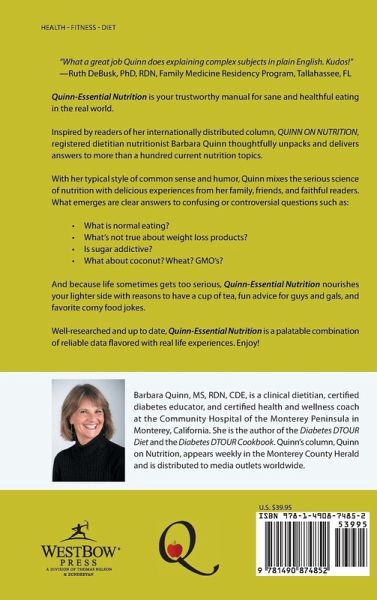 "What a great job Quinn does explaining complex subjects in plain English. Kudos!" -Ruth DeBusk, PhD, RDN, Family Medicine Residency Program, Tallahassee, FL Quinn-Essential Nutrition is your trustworthy manual for sane and healthful eating in the real world. Inspired by readers of her internationally distributed column, QUINN ON NUTRITION, registered dietitian nutritionist Barbara Quinn thoughtfully unpacks and delivers answers to more than a hundred current nutrition topics. With her typical style of common sense and humor, Quinn mixes the serious science of nutrition with delicious experiences from her family, friends, and faithful readers. What emerges are clear answers to confusing or controversial questions such as: ¿ What is normal eating? ¿ What's not true about weight loss products? ¿ Is sugar addictive? ¿ What about coconut? Wheat? GMO's? And because life sometimes gets too serious, Quinn-Essential Nutrition nourishes your lighter side with reasons to have a cup of tea, fun advice for guys and gals, and favorite corny food jokes. Well-researched and up to date, Quinn-Essential Nutrition is a palatable combination of reliable data flavored with real life experiences. Enjoy!