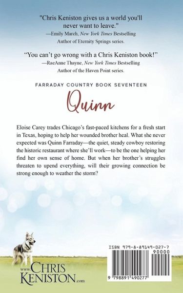 Big-city chef meets small-town cowboy-and the recipe for love is anything but simple. Eloise Carey trades Chicago's fast-paced kitchens for a fresh start in Texas, hoping to help her wounded brother heal. What she never expected was Quinn Farraday-the quiet, steady cowboy restoring the historic restaurant where she'll work-to be the one helping her find her own sense of home. But when her brother's struggles threaten to upend everything, will their growing connection be strong enough to weather the storm? In Tucker's Bluff, love has a way of surprising even the most guarded hearts. With Aunt Eileen and the Ladies Afternoon Social Club meddling, swoon-worthy cowboys stealing hearts, a German Shepherd with an instinct for matchmaking, and a ghost town renovation stirring up excitement, anything can happen. More from the Farraday Country series: Original Seven: Adam Brooks Connor Declan Ethan Finn Grace Texas cousins: Hannah Ian Jamison Keeping Eileen Loving Chloe Construction Cousins: Morgan Neil Owen Paxton Quinn Ryan