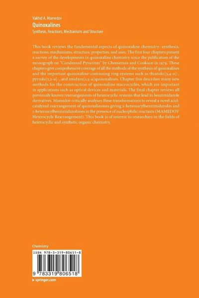 Thisbook reviews the fundamental aspects of quinoxaline chemistry: synthesis,reactions, mechanisms, structure, properties, and uses. The first four chapterspresent a survey of the developments in quinoxaline chemistry since thepublication of the monograph on "Condensed Pyrazines" by Cheeseman and Cooksonin 1979. These chapters give comprehensive coverage of all the methods of the synthesis of quinoxalinesand the important quinoxaline-containing ring systems suchas thiazolo[3,4-a]-, pyrrolo[1,2-a]-, and imidazo[1,5-a]quinoxalines.Chapter five describes many new methods for the construction of quinoxalinemacrocycles, which are important in applications such as optical devices andmaterials. The final chapter reviews all previously known rearrangements ofheterocyclic systems that lead to benzimidazole derivatives. Mamedov criticallyanalyses these transformations to reveal a novel acid-catalyzed rearrangementof quinoxalinones giving 2-heteroarylbenzimidazoles and1-heteroarylbenzimidazolones in the presence of nucleophilic reactants (MAMEDOVHeterocycle Rearrangement). This book is of interest to researchers in thefields of heterocyclic and synthetic organic chemistry.