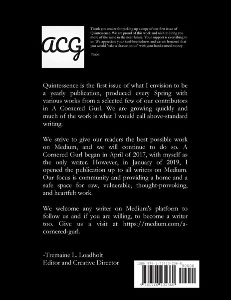 "Quintessence" is a literary magazine to be published yearly in the Spring. The writers you see featured in this literary magazine are contributors to A Cornered Gurl and have been faithful in their support, encouragement of others, and submitting strong and poignant work to be read freely on the platform. This is the first issue.