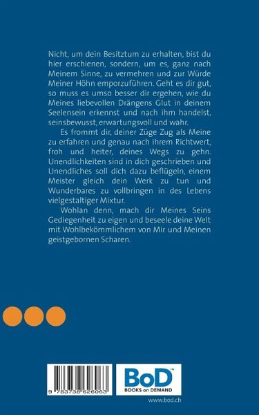 Nicht, um dein Besitztum zu erhalten, bist du hier erschienen, sondern, um es, ganz nach Meinem Sinne, zu vermehren und zur Würde Meiner Höhn emporzuführen. Geht es dir gut, so muss es umso besser dir ergehen, wie du Meines liebevollen Drängens Glut in deinem Seelensein erkennst und nach ihm handelst, seinsbewusst, erwartungsvoll und wahr. Es frommt dir, deiner Züge Zug als Meine zu erfahren und genau nach ihrem Richtwert, froh und heiter, deines Wegs zu gehn. Unendlichkeiten sind in dich geschrieben und Unendliches soll dich dazu beflügeln, einem Meister gleich dein Werk zu tun und Wunderbares zu vollbringen in des Lebens vielgestaltiger Mixtur.Wohlan denn, mach dir Meines Seins Gediegenheit zu eigen und beseele deine Welt mit Wohlbekömmlichem von Mir und Meinen geistgebornen Scharen.