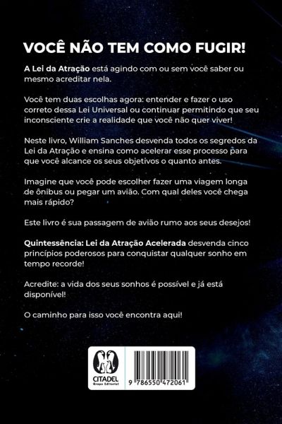 VOCÊ NÃO TEM COMO FUGIR! A Lei da Atração está agindo com ou sem você saber ou mesmo acreditar nela. Você tem duas escolhas agora: entender e fazer o uso correto dessa Lei Universal ou continuar permitindo que seu inconsciente crie a realidade que você não quer viver! Neste livro, William Sanches desvenda todos os segredos da Lei da Atração e ensina como acelerar esse processo para que você alcance os seus objetivos o quanto antes. Imagine que você pode escolher fazer uma viagem longa de ônibus ou pegar um avião. Com qual deles você chega mais rápido? Este livro é sua passagem de avião rumo aos seus desejos! Quintessência: Lei da Atração Acelerada desvenda cinco princípios poderosos para conquistar qualquer sonho em tempo recorde! Acredite: a vida dos seus sonhos é possível e já está disponível! O caminho para isso você encontra aqui!