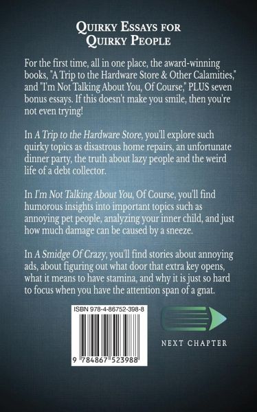 For the first time, all in one place, the award-winning books, "A Trip to the Hardware Store & Other Calamities," and "I'm Not Talking About You, Of Course," PLUS seven bonus essays. If this doesn't make you smile, then you're not even trying! In A Trip to the Hardware Store, you'll explore such quirky topics as disastrous home repairs, an unfortunate dinner party, the truth about lazy people and the weird life of a debt collector. In I'm Not Talking About You, Of Course, you'll find humorous insights into important topics such as annoying pet people, analyzing your inner child, and just how much damage can be caused by a sneeze. In A Smidge Of Crazy, you'll find stories about annoying ads, about figuring out what door that extra key opens, what it means to have stamina, and why it is just so hard to focus when you have the attention span of a gnat.