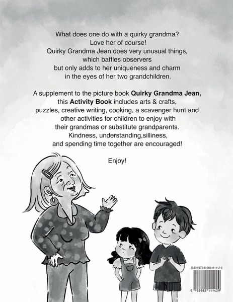 This Activity Book offers children the opportunity to spend time with grandparents (or substitute grandparents) in fun and meaningful ways. Filled with coloring pages, activity pages, an interview, scavenger hunt, arts and crafts, cooking ideas and more, it is designed to accompany the picture book Quirky Grandma Jean ~ a story told in rhyming verse about loving people just as they are. Intended for children ages 4 - 10.