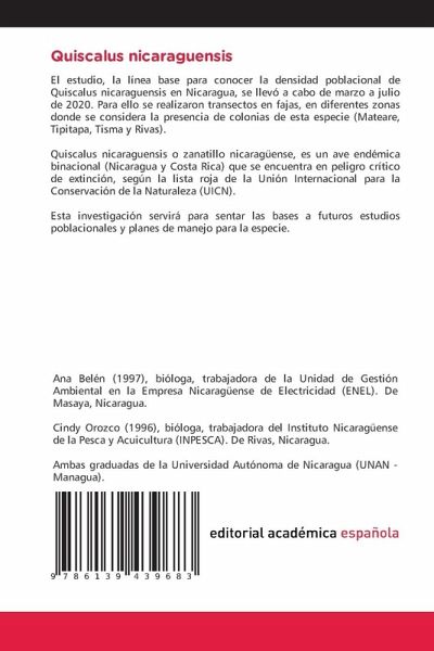 El estudio, la línea base para conocer la densidad poblacional de Quiscalus nicaraguensis en Nicaragua, se llevó a cabo de marzo a julio de 2020. Para ello se realizaron transectos en fajas, en diferentes zonas donde se considera la presencia de colonias de esta especie (Mateare, Tipitapa, Tisma y Rivas).Quiscalus nicaraguensis o zanatillo nicaragüense, es un ave endémica binacional (Nicaragua y Costa Rica) que se encuentra en peligro crítico de extinción, según la lista roja de la Unión Internacional para la Conservación de la Naturaleza (UICN).Esta investigación servirá para sentar las bases a futuros estudios poblacionales y planes de manejo para la especie.