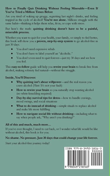 Are you tired of waking up groggy, regretting last night's drinks, and feeling trapped in the cycle of alcohol? You're not alone. Millions struggle with the same habit-thinking it helps them relax, fit in, or cope with stress. But here's the truth: quitting drinking doesn't have to be a painful, miserable process. Whether you want to quit for your health, your family, or simply to feel better, this book will show you a proven, step-by-step system to go alcohol-free in just 30 days. This easy-to-follow book will help you rewire your brain to break free from alcohol, making sobriety feel natural-without the struggle.Inside, You'll Discover:Why quitting isn't about willpower-and the real reason you crave alcohol (Hint: It's not your fault) How to rewire your brain so you naturally stop wanting alcohol (no white-knuckling required) Day-by-day survival tips for detox-how to handle cravings, mood swings, and social situations What to do instead of drinking-simple rituals to replace alcohol and make life more fulfilling No shame. No pressure. Just 30 days that could change your life forever. Start your alcohol-free journey today!
