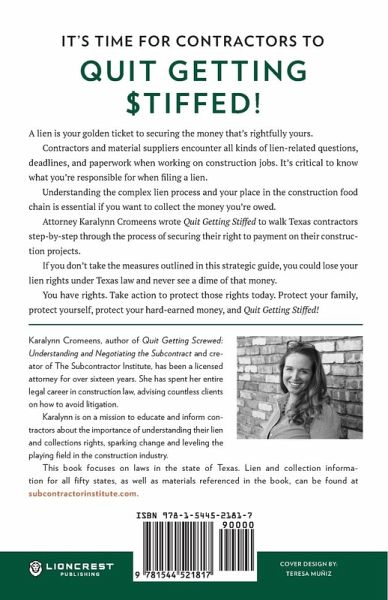 It's Time for Contractors to Quit Getting Stiffed! A lien is your golden ticket to securing the money that's rightfully yours. Contractors and material suppliers encounter all kinds of lien-related questions, deadlines, and paperwork when working on construction jobs. It's critical to know what you're responsible for when filing a lien. Understanding the complex lien process and your place in the construction food chain is essential if you want to collect the money you're owed. Attorney Karalynn Cromeens wrote Quit Getting Stiffed to walk Texas contractors step-by-step through the process of securing their right to payment on their construction projects. If you don't take the measures outlined in this strategic guide, you could lose your lien rights under Texas law and never see a dime of that money. ¿ You have rights. Take action to protect those rights today. Protect your family, protect yourself, protect your hard-earned money, and Quit Getting Stiffed!