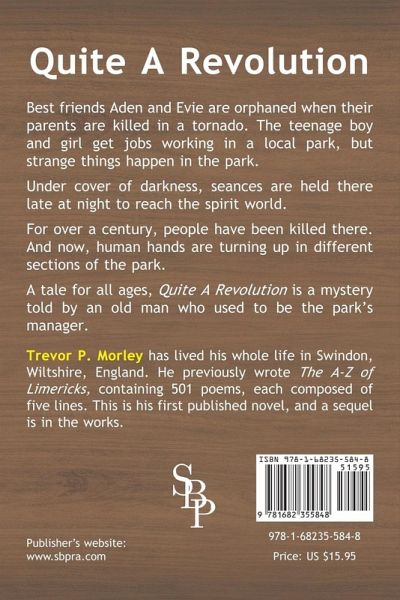 Best friends Aden and Evie are orphaned when their parents are killed in a tornado. The teenage boy and girl get jobs working in a local park, but strange things happen in the park. Under cover of darkness, seances are held there late at night to reach the spirit world. For over a century, people have been killed there. And now, human hands are turning up in different sections of the park. A tale for all ages, Quite A Revolution is a mystery told by an old man who used to be the park's manager. About The Author: Trevor P. Morley has lived his whole life in Swindon, Wiltshire, England. He previously wrote The A-Z of Limericks, containing 501 poems, each composed of five lines. This is his first published novel, and a sequel is in the works.