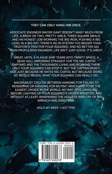 They can only hang him once. Associate Engineer Macer Gant doesn't want much from life. A brew or two, pretty girls, three square meals and an honest job working the big iron, pushing a big load, in a big sky. There's no in-system tug bigger than Truxton's Tractor Four Squared, and no better gig than propulsion engineer. Life isn't just good. It's great. Great, until a plague ship tears into Trinity space, a dead hull arrowing straight for the nic Cartaí shipyard and the thousands living and working there. Only Four Squared can stop it. But the captain won't, not just because he hates nic Cartaí, but because doing so would reveal what Four Squared can really do. Macer must choose between hanging for failing to render aid or hanging for mutiny. Which has to be the easiest choice in the world. No way is he dangling before lighting up Four Squared's hidden monster, and without at least whispering the ageless war cry of his wrench-wielding tribe. Hold my beer. I got this. Elsewhere... Ciarán mac Diarmuid, Wisp, and the crew of Quite Possibly Alien continue their quest, blazing a trail to Contract space and the mysterious customer anticipating their arrival. New wonders and terrors await after each heart-stopping stardive. And when Aoife nic Cartaí plunges into Trinity space aboard the battered prize vessel Golden Parachute she'll discover her enemies have outraced her. They now threaten not only the League, and the Freeman Federation, but her own family and the family and friends of the merchant apprentice she's sworn to protect. Ciarán and Aoife know they will need powerful allies to complete the mission and save the world. Macer Gant disagrees. They don't need all that. All they need is a big tug. And Macer Gant.