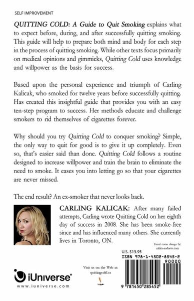 Quitting Cold: A Guide to Quit Smoking explains what to expect before, during, and after successfully quitting smoking. This guide will help to prepare both mind and body for each step in the process of quitting smoking. While other texts focus primarily on medical opinions and gimmicks, Quitting Cold uses knowledge and willpower as the basis for success. Based upon the personal experience and triumph of Carling Kalicak, who smoked for twelve years before successfully quitting, this insightful guide provides an easy ten-step program to success. Her methods educate and challenge smokers to rid themselves of cigarettes forever. Why should you try Quitting Cold to conquer smoking? Simple: the only way to quit for good is to give it up completely. Even so, that's easier said than done. Quitting Cold follows a routine that eases into letting go and ending this deadly habit once and for all. It offers a routine designed to increase willpower and to eliminate the need to smoke for good. The end result? An ex-smoker who never looks back.