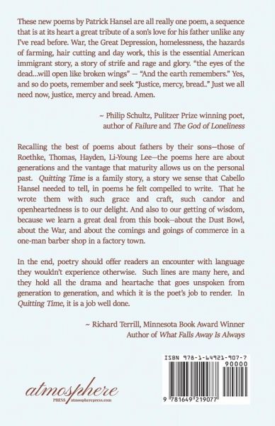 These new poems by Patrick Hansel are all really one poem, a sequence that is at its heart a great tribute of a son's love for his father unlike any I've read before. War, the Great Depression, homelessness, the hazards of farming, hair cutting and day work, this is the essential American immigrant story, a story of strife and rage and glory. "the eyes of the dead...will open like broken wings" - "And the earth remembers." Yes, and so do poets, remember and seek "Justice, mercy, bread.." Just we all need now, justice, mercy and bread. Amen. Philip Schultz, Pulitzer Prize winning poet, author of Failure and The God of Loneliness Recalling the best of poems about fathers by their sons-those of Roethke, Thomas, Hayden, Li-Young Lee-the poems here are about generations and the vantage that maturity allows us on the personal past. Quitting Time is a family story, a story we sense that Cabello Hansel needed to tell, in poems he felt compelled to write. That he wrote them with such grace and craft, such candor and openheartedness is to our delight. And also to our getting of wisdom, because we learn a great deal from this book-about the Dust Bowl, about the War, and about the comings and goings of commerce in a one-man barber shop in a factory town. In the end, poetry should offer readers an encounter with language they wouldn't experience otherwise. Such lines are many here, and they hold all the drama and heartache that goes unspoken from generation to generation, and which it is the poet's job to render. In Quitting Time, it is a job well done. Richard Terrill Minnesota Book Award Winner Author of What Falls Away Is Always