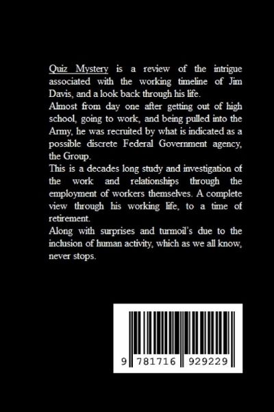 Quiz Mystery is a review of the intrigue associated with the working timeline of Jim Davis, and a look back through his life. Almost from day one after getting out of high school, going to work, and being pulled into the Army, he was recruited by what is indicated as a possible discrete Federal Government agency, the Group. This is a decades long study and investigation of the work and relationships through his employment. A complete view to a time of retirement. Along with surprises and turmoil's due to the inclusion of human activity, which as we all know, never stops.
