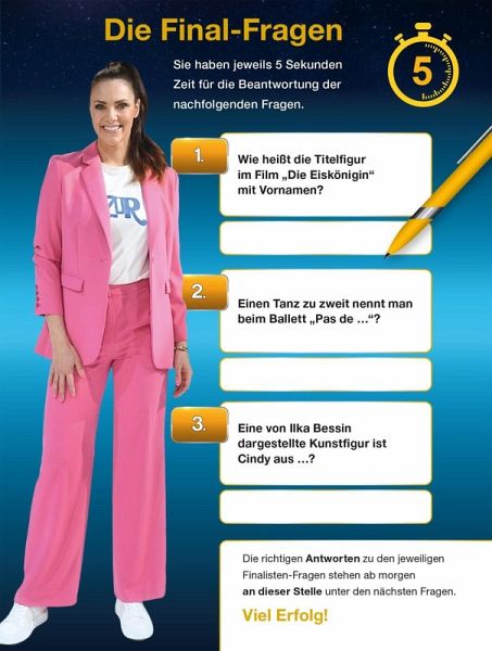 Hinter jeder täglichen Doppelseite verbergen sich unterhaltsame Rätsel und knifflige Fragen rund um die Show und ihre prominenten Kandidaten. Dieses Buch stellt dein Allgemeinwissen auf die Probe und dich bestens unterhalten.