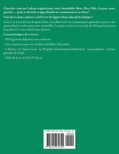 Cherchez-vous un Cadeau original pour votre formidable Mère, Père, Fille, Garçon, amis, proches ... pour se divertir et approfondir ses connaissances en islam ? Vous devez donc acheter ce joli Livre de Quizz islam éducatif & ludique ! Grâce à ce Livre de jeux de quizz islam, vous allez tester vos connaissances générales et jouer à des quizzs islam en solo, entre amis, en famille. Ce quizz consiste en une série de 300 questions pour lesquelles il y a une seule bonne réponse. Caractéristiques de ce Livre : - 300 Questions Réponses avec solutions - Gros caractères pour une meilleure lisibilité (20 points) - 4 Thèmes : Le Saint Coran - Le Prophète Mouhammad (Mahomet) - Les prophètes - Culture générale de l'islam - Taille du Livre 21.59×27.94 cm