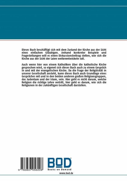 Dieses Buch beschäftigt sich mit dem Zustand der Kirche aus der Sicht eines einfachen Gläubigen. Anhand konkreter Beispiele und Fragestellungen will es einen Diskussionsbeitrag stellen, wie sich die Kirche aus der Sicht der Laien weiterentwickeln soll.Auch wenn hier von einem Katholiken über die katholische Kirche gesprochen wird, so eignet sich dieses Buch auch zu einem Gespräch in und mit der evangelischen Kirche. Da die Frage der Religiösität in unserer Gesellschaft ansteht, kann dieses Buch auch Grundlage eines Gespräches mit und in den beiden anderen großen Religionsgruppen, das Judentum und der Islam, sein. hier geht es nicht darum, welche Religion die richtige Lehre vertritt, hier geht es darum, wie sich die Religionen in der zukünftigen Gesellschaft darstellen.