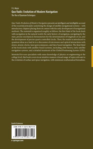 Quo Vadis: Evolution of Modern Navigation presents an intelligent and intelligible account of the essential principles underlying the design of satellite navigational systems-with introductory chapters placing them in context with the early development of navigational methods. The material is organized roughly as follows: the first third of the book deals with navigation in the natural world, the early history of navigation, navigating by the stars, precise mechanical chronometers for the determination of longitude at sea, and the development of precise quartz controlled clocks. Then, the reader is introduced to quantum ideas as a lead in to a discussion of microwave and optical interactions with atoms, atomic clocks, laser gyrocompasses, and time based navigation. The final third of the book deals with satellite-based systems, including orbit theory, early satellite navigation systems, and a detailed treatment of the Global Positioning System (GPS).