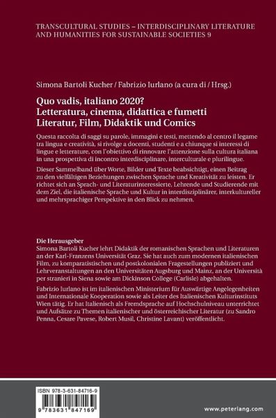 Simona Bartoli Kucher lehrt Didaktik der romanischen Sprachen und Literaturen an der Karl-Franzens Universität Graz. Sie hat auch zum modernen italienischen Film, zu komparatistischen und postkolonialen Fragestellungen publiziert und Lehrveranstaltungen an den Universitäten Augsburg und Mainz, an der Università per stranieri in Siena sowie am Dickinson College (Carlisle) abgehalten. Fabrizio Iurlano ist im italienischen Ministerium für Auswärtige Angelegenheiten und Internationale Kooperation sowie als Leiter des Italienischen Kulturinstituts Wien tätig. Er hat Italienisch als Fremdsprache auf Hochschulniveau unterrichtet und Aufsätze zu Themen italienischer und österreichischer Literatur (zu Sandro Penna, Cesare Pavese, Robert Musil, Christine Lavant) veröffentlicht.