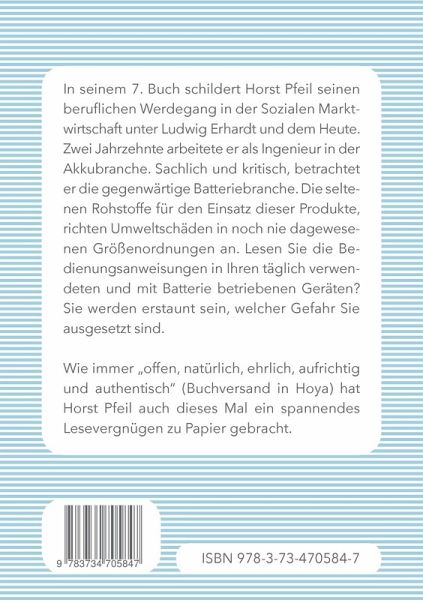 Horst Pfeil, Autor von bisher sieben erschienen Büchern, ist im Jahr 1936 in Leipzig geboren und lebte seit 1947 "illegal" in Hamburg. Seine Berufung war die Elektrotechnik. Techniker und Elektromeister in 44 Berufsjahren, davon 20 Jahre in der Akkubranche, zuletzt als Geschäftsführer tätig. In den neunziger Jahren begann seine ehrenamtliche Tätigkeit in Hamburg. Dem im Jahr 1883 gegründeten Hohenfelder und Uhlenhorster Bürgerverein, war er 1. Vorsitzender für einen Zeitraum von 10 Jahren. Für die Hohenfelder und Uhlenhorster Rundschau war er 5 Jahre lang für die Redaktionsarbeit zuständig. Er war Mitglied in der Hamburger Mittelstands Vereinigung, kurz MIT genannt. Bis zu seinem 65sten Lebensjahr, war der Autor auch als Schöffe bei Gericht tätig. Seine Aufmerksamkeit in der öffentlichen Wahrnehmung, erreichte er in Hamburg, durch seine unerschrockene Arbeitsweise. Nicht immer zur Zufriedenheit der regierenden Parteien. Für ihn stand immer der Bürger im Vordergrund. In verschiedenen, in Hamburg erschienen Büchern und Artikeln, findet der Leser den Namen Horst Pfeil. Beispielhaft im "Uhlenhorst Buch" von Matthias Schmoock. Im Buch "Tattoo Theo" von Marcel Feige. In der Festschrift von Matthias Jochem: Zum 100 Jahrestag von Eduard Rhein (Erfinder der Hörzu und der Meckifigur). In einer Jahresfestschrift des "Club Seefahrt Hamburg e.V.". Im Frühfernsehen HH1 mit Alf Völkers und Horst Pfeil, mit einer Foto-Ausstellung Hohenfelde und Uhlenhorst zwischen "Gestern und heute". Diese Fotoausstellung wurde seinerzeit zum Tagesgespräch in Hamburg. Anfang des neuen Jahrtausends zog es seine Frau und ihn nach Andalusien. Dort führte er für gut 14 Jahre ein einfaches Leben als "Camposino" in den Bergen Andalusiens. Nun lebt der Autor mit seiner Frau in Buchholz in der Nordheide. Sollten sie ihn persönlich treffen, ist allerdings Vorsicht geboten! Er nimmt sich nämlich selber nicht ernst, spricht gerne und erzählt Ihnen unter Umständen, ellenlange Geschichten aus seinem Leben. Und all das in einer Zeit, in der das Gegenüber kaum Zeit hat.