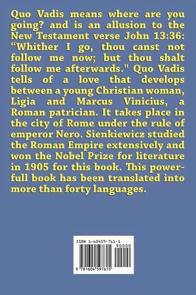 Quo Vadis means where are you going? and is an allusion to the New Testament verse John 13:36: "Whither I go, thou canst not follow me now; but thou shalt follow me afterwards." Quo Vadis tells of a love that develops between a young Christian woman, Ligia and Marcus Vinicius, a Roman patrician. It takes place in the city of Rome under the rule of emperor Nero. Sienkiewicz studied the Roman Empire extensively and won the Nobel Prize for literature in 1905 for this book. This powerfull book has been translated into more than forty languages.