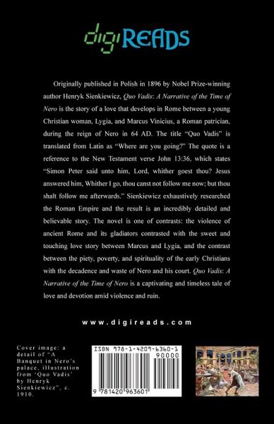 Originally published in Polish in 1896 by Nobel Prize-winning author Henryk Sienkiewicz, "Quo Vadis: A Narrative of the Time of Nero" is the story of a love that develops in Rome between a young Christian woman, Lygia, and Marcus Vinicius, a Roman patrician, during the reign of Nero in 64 AD. The title "Quo Vadis" is translated from Latin as "Where are you going?" The quote is a reference to the New Testament verse John 13:36, which states "Simon Peter said unto him, Lord, whither goest thou? Jesus answered him, Whither I go, thou canst not follow me now; but thou shalt follow me afterwards."…mehr
