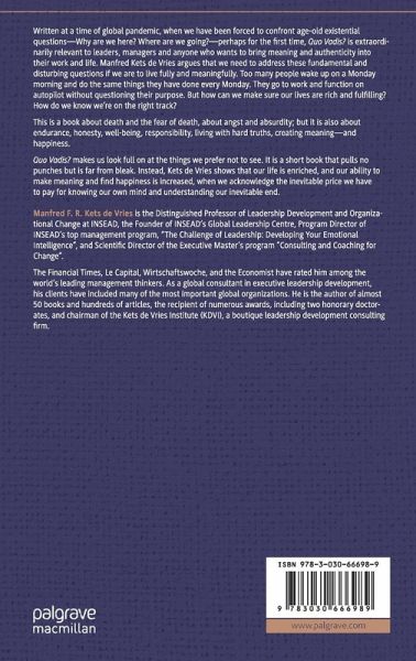 Written at a time of global pandemic, when we have been forced to confront age-old existential questions-Why are we here? Where are we going?-perhaps for the first time, Quo Vadis? is extraordinarily relevant to leaders, managers and anyone who wants to bring meaning and authenticity into their work and life. Manfred Kets de Vries argues that we need to address these fundamental and disturbing questions if we are to live fully and meaningfully. Too many people wake up on a Monday morning and do the same things they have done every Monday. They go to work and function on autopilot without questioning their purpose. But how can we make sure our lives are rich and fulfilling? How do we know we're on the right track?