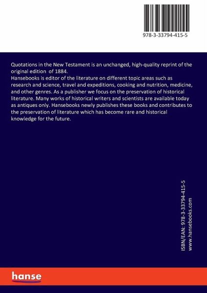 Quotations in the New Testament is an unchanged, high-quality reprint of the original edition of 1884. Hansebooks is editor of the literature on different topic areas such as research and science, travel and expeditions, cooking and nutrition, medicine, and other genres. As a publisher we focus on the preservation of historical literature. Many works of historical writers and scientists are available today as antiques only. Hansebooks newly publishes these books and contributes to the preservation of literature which has become rare and historical knowledge for the future.