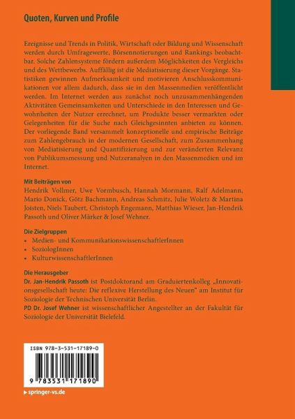 Ereignisse und Trends in Politik, Wirtschaft oder Bildung und Wissenschaft werden durch Umfragewerte, Börsennotierungen und Rankings beobachtbar. Solche Zahlen¬sys¬teme fördern außerdem Möglichkeiten des Vergleichs und des Wettbewerbs. Auf¬fällig ist die Mediatisierung dieser Vorgänge. Statistiken gewinnen Aufmerksamkeit und motivieren Anschluss¬kommuni¬ka¬tionen vor allem dadurch, dass sie in den Massenmedien veröffentlicht werden. Im Internet werden aus zunächst noch unzu¬sammen¬hängen¬den Aktivitäten Gemein-sam¬kei¬ten und Unterschiede in den Interessen und Gewohnheiten der Nutzer errechnet, um Pro¬duk¬te besser vermarkten oder Gelegenheiten für die Suche nach Gleichgesinnten anbieten zu können. Der vorliegende Band versammelt konzeptionelle und empirische Beiträge zum Zahlengebrauch in der modernen Gesellschaft, zum Zusammenhang von Mediatisierung und Quantifizierung und zur veränderten Relevanz von Publikumsmessung und Nutzeranalyen in den Massenmedien und im Internet.