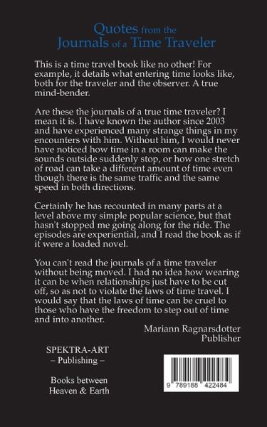 This is a time travel book like no other! For example, it details what entering time looks like, both for the traveler and the observer. A true mind-bender. Are these the journals of a true time traveler? I mean it is. I have known the author since 2003 and have experienced many strange things in my encounters with him. Without him, I would never have noticed how time in a room can make the sounds outside suddenly stop, or how one stretch of road can take a different amount of time even though there is the same traffic and the same speed in both directions. Certainly he has recounted in many parts at a level above my simple popular science, but that hasn't stopped me going along for the ride. The episodes are experiential, and I read the book as if it were a loaded novel. You can't read the journals of a time traveler without being moved. I had no idea how wearing it can be when relationships just have to be cut off, so as not to violate the laws of time travel. I would say that the laws of time can be cruel to those who have the freedom to step out of time and into another.