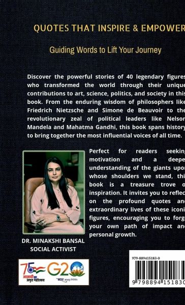 Discover the powerful stories of 40 legendary figures who transformed the world through their unique contributions to art, science, politics, and society in this book. From the enduring wisdom of philosophers like Friedrich Nietzsche and Simone de Beauvoir to the revolutionary zeal of political leaders like Nelson Mandela and Mahatma Gandhi, this book spans history to bring together the most influential voices of all time. Perfect for readers seeking motivation and a deeper understanding of the giants upon whose shoulders we stand, this book is a treasure trove of inspiration. It invites you to reflect on the profound quotes and extraordinary lives of these iconic figures, encouraging you to forge your own path of impact and personal growth.