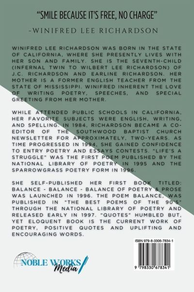 It's a delightful collection of inspiring words that will uplift, encourage, and place an instant smile on your face. This vibrant book is filled with heartfelt quotes, beautiful poems, an autograph, songs and Bible scriptures, each page is adorned with colorful pictures that sparks joy. Designed to bring warmth and positivity, it serves as a breath of fresh air, making it a cherished keepsake for all who seek inspiration.