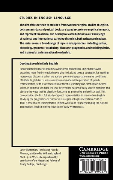 This study of speech representation in English texts from 1350 1600 examines the problems of interpreting discourse in these early works.