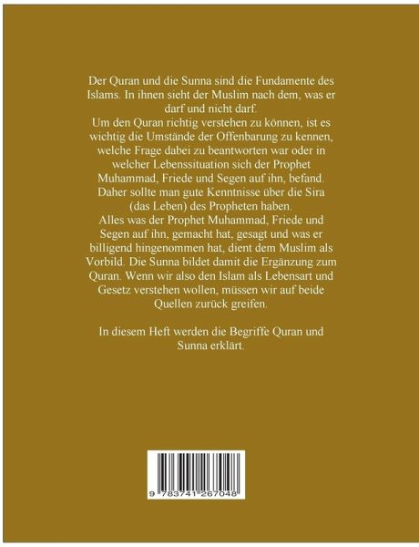 Der Quran und die Sunna sind die Fundamente des Islams. In ihnen sieht der Muslim nach dem, was er darf und nicht darf.Um den Quran richtig verstehen zu können, ist es wichtig die Umstände der Offenbarung zu kennen, welche Frage dabei zu beantworten war oder in welcher Lebenssituation sich der Prophet Muhammad, Friede und Segen auf ihn, befand. Daher sollte man gute Kenntnisse über die Sira (das Leben) des Propheten haben.Alles was der Prophet Muhammad, Friede und Segen auf ihn, gemacht hat, gesagt und was er billigend hingenommen hat, dient dem Muslim als Vorbild. Die Sunna bildet damit die Ergänzung zum Quran. Wenn wir also den Islam als Lebensart und Gesetz verstehen wollen, müssen wir auf beide Quellen zurückgreifen.In diesem Heft werden die Begriffe Quran und Sunna erklärt.