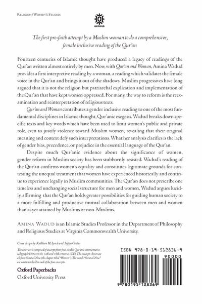 Fourteen centuries of Islamic thought have produced a legacy of interpretive readings of the Qu'ran written almost entirely by men. Now, with Qu'ran and Woman, Amina Wadud provides a first interpretive reading by a woman, a reading which validates the female voice in the Qu'ran and brings it out of the shadows. Muslim progressives have long argued that it is not the religion but patriarchal interpretation and implementation of the Qu'ran that have kept women oppressed. For many, the way to reform is the reexamination and reinterpretation of religious texts. Qu'ran and Woman contributes a gender inclusive reading to one of the most fundamental disciplines in Islamic thought, Qu'ranic exegesis. Wadud breaks down specific texts and key words which have been used to limit women's public and private role, even to justify violence toward Muslim women, revealing that their original meaning and context defy such interpretations. What her analysis clarifies is the lack of gender bias, precedence, or prejudice in the essential language of the Qur'an. Despite much Qu'ranic evidence about the significance of women, gender reform in Muslim society has been stubbornly resisted. Wadud's reading of the Qu'ran confirms womens equality and constitutes legitimate grounds for contesting the unequal treatment that women have experienced historically and continue to experience legally in Muslim communities. The Qu'ran does not prescribe one timeless and unchanging social structure for men and women, Wadud argues lucidly, affirming that the Qu'ran holds greater possibilities for guiding human society to a more fulfilling and productive mutual collaboration between men and women than as yet attained by Muslims or non-Muslims.