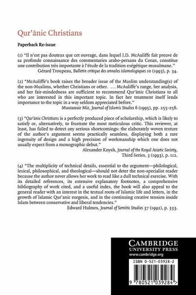 The Muslim perception of Christianity and Christians is an issue of longstanding debate among scholars of both Islam and Christianity. In this book, Jane McAuliffe analyzes a series of passages from the Qur'an that make ostensibly positive remarks about Christians. She conducts this analysis through a close examination of Muslim exegesis of the Qur'an, spanning ten centuries of commentary. In this effort to trace various interpretations of these passages, the author attempts to determine whether these positive passages can justifiably serve as proof-texts of Muslim tolerance of Christianity. She finds that commentators have consistently distinguished between the vast majority of Christians, who are denounced for having turned from the true word of God, and a small minority, who accepted the prophethood of Muhammed and are praised.