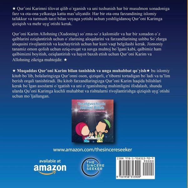 ¿ Qur'oni Karimni tilovat qilib o`rganish va uni tushunish har bir musulmon xonadoniga farz va ota-ona yelkasiga katta mas'uliyatdir. Har bir ota-ona farzandining islomiy tafakkur va turmush tarzi bilan voyaga yetishi uchun yoshligidanoq Qur'oni Karimga qiziqish va mehr uyg`otishi kerak. Qur'oni Karim Allohning (Xudoning) so`zma-so`z kalomidir va har bir xonadon o`z qalblarini oziqlantirish uchun o`zlarining aloqalarini va farzandlarining ushbu So`zlarga aloqasini rivojlantirish va kuchaytirish uchun har kuni vaqt belgilashi kerak. Jismoniy tanamiz omon qolish uchun oziq-ovqat va suvga muhtoj bo`lgani kabi, qalbimiz ham qalbimizni boyitish, oziqlantirish va hayot baxsh etish uchun Qur'oni Karim va Allohning zikriga muhtojdir. ¿ ¿ Muqaddas Qur'oni Karim bilan tanishish va unga muhabbat qo`yish¿ bu islomiy kitob bo`lib, bolalaringizga Qur'onni oson, qiziqarli, e'tiborni tortadigan bo`ladi va ta'lim berish orqali tanishtiradi. Bu kitob farzandlaringizga Qur'oni Karim haqida bilishlari kerak bo`lgan asoslarni o`rgatish va uni o`rganishning muhimligini ifodalash, shunda ularda Qu'oni Karimga kuchli muhabbat va rishtalarni rivojlantirishga qiziqish uyg`otishi uchun mo`ljallangan.