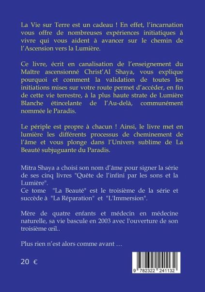 La Vie sur Terre est un cadeau ! En effet, l'incarnation vous offre de nombreuses expériences initiatiques à vivre qui vous aident à avancer sur le chemin de l'Ascension vers la Lumière.Ce livre, écrit en canalisation de l'enseignement du Maître ascensionné Christ'Al Shaya, vous explique pourquoi et comment la validation de toutes les initiations mises sur votre route permet d'accéder, en fin de cette vie terrestre, à la plus haute strate de Lumière Blanche étincelante de l'Au-delà, communément nommée le Paradis.Le périple est propre à chacun ! Ainsi, le livre met en lumière les différents processus de cheminement de l'âme et vous plonge dans l'Univers Sublime de la Beauté subjuguante du Paradis.