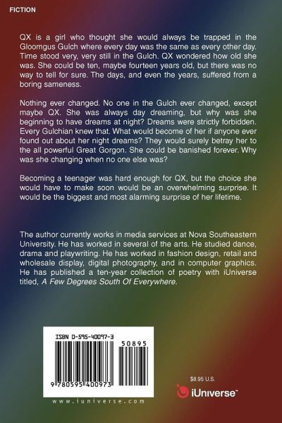 QX is a girl who thought she would always be trapped in the Gloomgus Gulch where every day was the same as every other day. Time stood very, very still in the Gulch. QX wondered how old she was. She could be ten, maybe fourteen years old, but there was no way to tell for sure. The days, and even the years, suffered from a boring sameness. Nothing ever changed. No one in the Gulch ever changed, except maybe QX. She was always day dreaming, but why was she beginning to have dreams at night? Dreams were strictly forbidden. Every Gulchian knew that. What would become of her if anyone ever found out about her night dreams? They would surely betray her to the all powerful Great Gorgon. She could be banished forever. Why was she changing when no one else was? Becoming a teenager was hard enough for QX, but the choice she would have to make soon would be an overwhelming surprise. It would be the biggest and most alarming surprise of her lifetime.