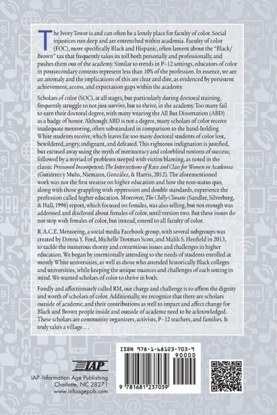 A volume in Contemporary Perspectives on Access, Equity, and Achievement The Ivory Tower is and can often be a lonely place for faculty of color. Social injustices run deep and are entrenched within academia. Faculty of color (FOC), more specifically Black and Hispanic, often lament about the 'Black/Brown' tax that frequently takes its toll both personally and professionally, and pushes them out of the academy. Similar to trends in P¿12 settings, educators of color in postsecondary contexts represent less than 10% of the profession. In essence, we are an anomaly and the implications of this are clear and dire, as evidenced by persistent achievement, access, and expectation gaps within the academy. Scholars of color (SOC), at all stages, but particularly during doctoral training, frequently struggle to not just survive, but to thrive, in the academy. Too many fail to earn their doctoral degree, with many wearing the All But Dissertation (ABD) as a badge of honor. Although ABD is not a degree, many scholars of color receive inadequate mentoring, often substandard in comparison to the hand¿holding White students receive, which leaves far too many doctoral students of color lost, bewildered, angry, indignant, and defeated. This righteous indignation is justified, but excused away using the myth of meritocracy and colorblind notions of success; followed by a myriad of problems steeped with victim blaming, as noted in the classic Presumed Incompetent: The Intersections of Race and Class for Women in Academia (Gutiérrez y Muhs, Niemann, González, & Harris, 2012). The aforementioned work was not the first treatise on higher education and how the non¿status quo, along with those grappling with oppression and double standards, experience the profession called higher education. Moreover, The Chilly Climate (Sandler, Silverberg, & Hall, 1996) report, which focused on females, was also telling, but not enough was addressed and disclosed about females of color, until version two. But these issues do not stop with females of color, but instead, extend to all faculty of color. R.A.C.E. Mentoring, a social media Facebook group, with several subgroups (see Figures 1 and 2) was created by Donna Y. Ford, Michelle Trotman Scott, and Malik S. Henfield in 2013, to tackle the numerous thorny and contentious issues and challenges in higher education. We began by intentionally attending to the needs of students enrolled at mostly White universities, as well as those who attended historically Black colleges and universities, while keeping the unique nuances and challenges of each setting in mind. We wanted scholars of color to thrive in both. Fondly and affectionately called RM, our charge and challenge is to affirm the dignity and worth of scholars of color. Additionally, we recognize that there are scholars outside of academe, and their contributions as well to impact and affect change for Black and Brown people inside and outside of academe need to be acknowledged. These scholars are community organizers, activists, P¿12 teachers, and families. It truly takes a village…