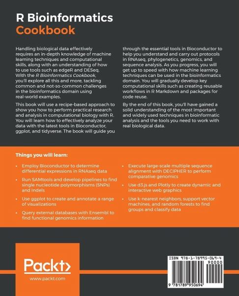 Over 60 recipes to model and handle real-life biological data using modern libraries from the R ecosystem Key Features:Apply modern R packages to handle biological data using real-world examples Represent biological data with advanced visualizations suitable for research and publications Handle real-world problems in bioinformatics such as next-generation sequencing, metagenomics, and automating analyses Book Description: Handling biological data effectively requires an in-depth knowledge of machine learning techniques and computational skills, along with an understanding of how to use tools such as edgeR and DESeq. With the R Bioinformatics Cookbook, you'll explore all this and more, tackling common and not-so-common challenges in the bioinformatics domain using real-world examples. This book will use a recipe-based approach to show you how to perform practical research and analysis in computational biology with R. You will learn how to effectively analyze your data with the latest tools in Bioconductor, ggplot, and tidyverse. The book will guide you through the essential tools in Bioconductor to help you understand and carry out protocols in RNAseq, phylogenetics, genomics, and sequence analysis. As you progress, you will get up to speed with how machine learning techniques can be used in the bioinformatics domain. You will gradually develop key computational skills such as creating reusable workflows in R Markdown and packages for code reuse. By the end of this book, you'll have gained a solid understanding of the most important and widely used techniques in bioinformatic analysis and the tools you need to work with real biological data. What You Will Learn:Employ Bioconductor to determine differential expressions in RNAseq data Run SAMtools and develop pipelines to find single nucleotide polymorphisms (SNPs) and Indels Use ggplot to create and annotate a range of visualizations Query external databases with Ensembl to find functional genomics information Execute large-scale multiple sequence alignment with DECIPHER to perform comparative genomics Use d3.js and Plotly to create dynamic and interactive web graphics Use k-nearest neighbors, support vector machines and random forests to find groups and classify data Who this book is for: ¿This book is for bioinformaticians, data analysts, researchers, and R developers who want to address intermediate-to-advanced biological and bioinformatics problems by learning through a recipe-based approach. Working knowledge of R programming language and basic knowledge of bioinformatics are prerequisites.