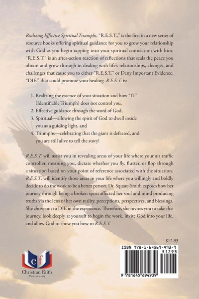 Realizing Effective Spiritual Triumphs, "R.E.S.T," is the first in a new series of resource books offering spiritual guidance for you to grow your relationship with God as you begin tapping into your spiritual connection with him. "R.E.S.T" is an after-action reaction of reflections that seals the peace you obtain and grow through in dealing with life's relationships, changes, and challenges that cause you to either "R.E.S.T" or Deny Important Evidence, "DIE," that could promote your healing. R.E.S.T is: 1. Realizing the essence of your situation and how "IT" (Identifiable Triumph) does not control you, 2. Effective guidance through the word of God, 3. Spiritual--allowing the spirit of God to dwell inside you as a guiding light, and 4. Triumphs--celebrating that the giant is defeated, and you are still alive to tell the story! R.E.S.T will assist you in revealing areas of your life where your air traffic controller, meaning you, dictate whether you fly, flutter, or flop through a situation based on your point of reference associated with the situation. R.E.S.T will identify those areas in your life where you willingly and boldly decide to do the work to be a better person. Dr. Square-Smith exposes how her journey through being a broken spirit affected her soul and mind producing truths via the lens of her own reality, perceptions, perspectives, and blessings. She chose not to DIE in the experience. Therefore, she invites you to take this journey, look deeply at yourself to begin the work, invite God into your life, and allow God to show you how to R.E.S.T.