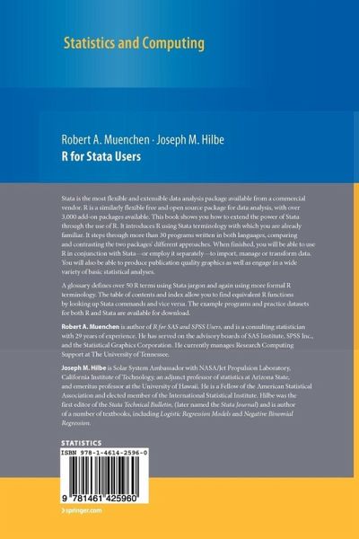 Stata is the most flexible and extensible data analysis package available from a commercial vendor. R is a similarly flexible free and open source package for data analysis, with over 3,000 add-on packages available. This book shows you how to extend the power of Stata through the use of R. It introduces R using Stata terminology with which you are already familiar. It steps through more than 30 programs written in both languages, comparing and contrasting the two packages' different approaches. When finished, you will be able to use R in conjunction with Stata, or separately, to import data, manage and transform it, create publication quality graphics, and perform basic statistical analyses.