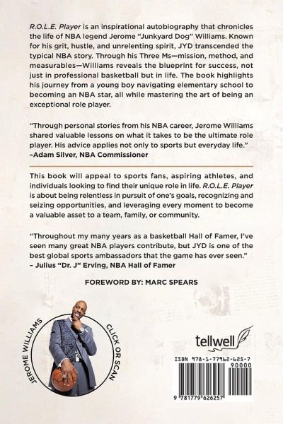 R.O.L.E. Player is an inspirational autobiography that chronicles the life of NBA legend Jerome "Junkyard Dog" Williams. Known for his grit, hustle, and unrelenting spirit, JYD transcended the typical NBA story. Through his Three Ms-mission, method, and measurables-Williams reveals the blueprint for success, not just in professional basketball but in life. The book highlights his journey from a young boy navigating elementary school to becoming an NBA star, all while mastering the art of being an exceptional role player. "Through personal stories from his NBA career, Jerome Williams shared valuable lessons on what it takes to be the ultimate role player. His advice applies not only to sports but everyday life." -Adam Silver, NBA Commissioner This book will appeal to sports fans, aspiring athletes, and individuals looking to find their unique role in life. R.O.L.E. Player is about being relentless in pursuit of one's goals, recognizing and seizing opportunities, and leveraging every moment to become a valuable asset to a team, family, or community. "Throughout my many years as a basketball Hall of Famer, I've seen many great NBA players contribute, but JYD is one of the best global sports ambassadors that the game has ever seen." - Julius "Dr. J" Erving, NBA Hall of Famer
