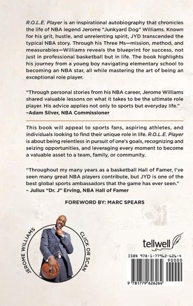 R.O.L.E. Player is an inspirational autobiography that chronicles the life of NBA legend Jerome "Junkyard Dog" Williams. Known for his grit, hustle, and unrelenting spirit, JYD transcended the typical NBA story. Through his Three Ms-mission, method, and measurables-Williams reveals the blueprint for success, not just in professional basketball but in life. The book highlights his journey from a young boy navigating elementary school to becoming an NBA star, all while mastering the art of being an exceptional role player. "Through personal stories from his NBA career, Jerome Williams shared valuable lessons on what it takes to be the ultimate role player. His advice applies not only to sports but everyday life." -Adam Silver, NBA Commissioner This book will appeal to sports fans, aspiring athletes, and individuals looking to find their unique role in life. R.O.L.E. Player is about being relentless in pursuit of one's goals, recognizing and seizing opportunities, and leveraging every moment to become a valuable asset to a team, family, or community. "Throughout my many years as a basketball Hall of Famer, I've seen many great NBA players contribute, but JYD is one of the best global sports ambassadors that the game has ever seen." - Julius "Dr. J" Erving, NBA Hall of Famer